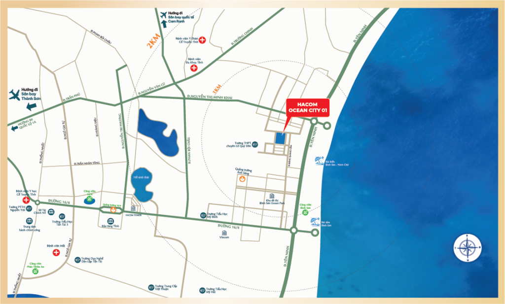 Tọa lạc ngay trung tâm Khu đô thị biển Bình Sơn – Ninh Chữ (Khu K2), Hacom Ocean City 01 không chỉ sở hữu vị trí sát biển hiếm có mà còn kết nối nhanh chóng đến hệ thống hạ tầng tiện ích trọng yếu của Nam Khánh Hòa.